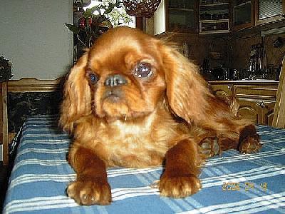 O plemeni:KING CHARLES ŠPANĚL - malé společenské plemeno 9.skupiny FCI, menší příbuzný Kavalír King Charles Španěla se kterým si ho lidé často pletou. KING CHARLES ŠPANĚL a KAVALÍR KING CHARLES ŠPANĚL se vyskytují ve stejných čtyřech barevných variantách , ale jsou to dvě různá i když příbuzná plemena, což mnoho lidí kvůli jejich podobným jménům vůbec netuší. Ti kteří to vědí, většinou považují Kavalíra za toho "normálního psa" a Kinga za toho pomalého a líného gaučáka, který se doma povaluje na polštářku a je jen na mazlení. Takže mnohé překvapí, že King je naprosto čiperný a temperamentní pes který běhá, skáče, plave, cvičí a chodí na dlouhé túry. Záleží vždy na pánovi, co si z něho udělá, stejně jako u ostatních plemen. King je oproti Kavalírovi menší, klidnější, méně uštěkaný a více vázaný na svého pána.Starší majitelé ho mohou mnohem lépe ovládat a snadno ho i unesou. Nemá dlouhý nos jako Kavalír, ale ani v největších vedrech mu to nijak nevadí, netrpí žádnými dýchacími obtížemi a na výletech neprská, nefuní, nechrochtá a není po chvíli napůl udušený, jako některá jiná plemena s krátkým nosem. King Charles španěl patří k málopočetným plemenům, má klidnou, vyrovnanou, jemnou a citlivou povahu, v dospělosti váží kolem 6,5 kg , takže se dá dobře nosit, chovat a všude se vejde, ale není zas tak malý, aby měl páníček strach, že ho zašlápne. Nikde nepřekáží, nic neničí a rychle se naučí být čistotný. Není divoký a v bytě dobře hlídá. Je velmi inteligentní, vhodé plemeno pro osamělé lidi, seniory i rodiny s dětmi, které musí být obeznámené s tím, jak se mají k psovi chovat. Pokud s ním budou zacházet nevhodně a nebo mu ubližovat, nenechá si to líbit, důrazně se proti tomu ohradí a příště bude opatrný a rezervovaný, nebot´má výbornou pamětˇ. Neodejde hned s každým, kdo si s ním chce hrát, fixuje se hodně na svého pána, kterému je bezmezně oddaný. Vcítí se do každé jeho nálady, které se přizpůsobí. Je přítulný, ale ne vtíravý. Není to žádný pecivál, procházky vyloženě nevyžaduje, ale chodí na ně rád, bez problémů podnikne i dlouhé cesty, drží se blízko svého pána , neutíká a rychle se naučí přivolání. U některých jedinců se může projevit menší lovecký pud, ale není to o tom, že pán stojí někde sám v lese strachy bez sebe a jeho pes lítá dva kilometry daleko za zajícem. Kinga může zajíc také zajímat, ale stejně si svého pána stále hlídá a v tomto směru mu žádné horké chvilky nepřipraví. Dobře se snáší s ostatními zvířaty. Údržba nedá velkou práci, srst se nestříhá, pouze pročesává a občas osprchuje. King je nenáročný a milý rodinný společník, dobře a rychle si ho vychová i začátečník a je z něho bezproblémový pejsek pro radost, který může svého pána doprovázet skoro všude. Jeho výraz je téměř lidský, kdo jednou pozná zblízka Kinga,propadne jeho kouzlu a jiné plemeno již nechce.Jeho původ je královský,byli to milovaní psíci krále Karla II. a anglické šlechty.